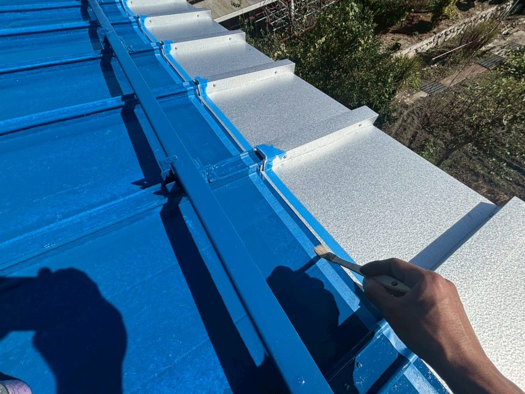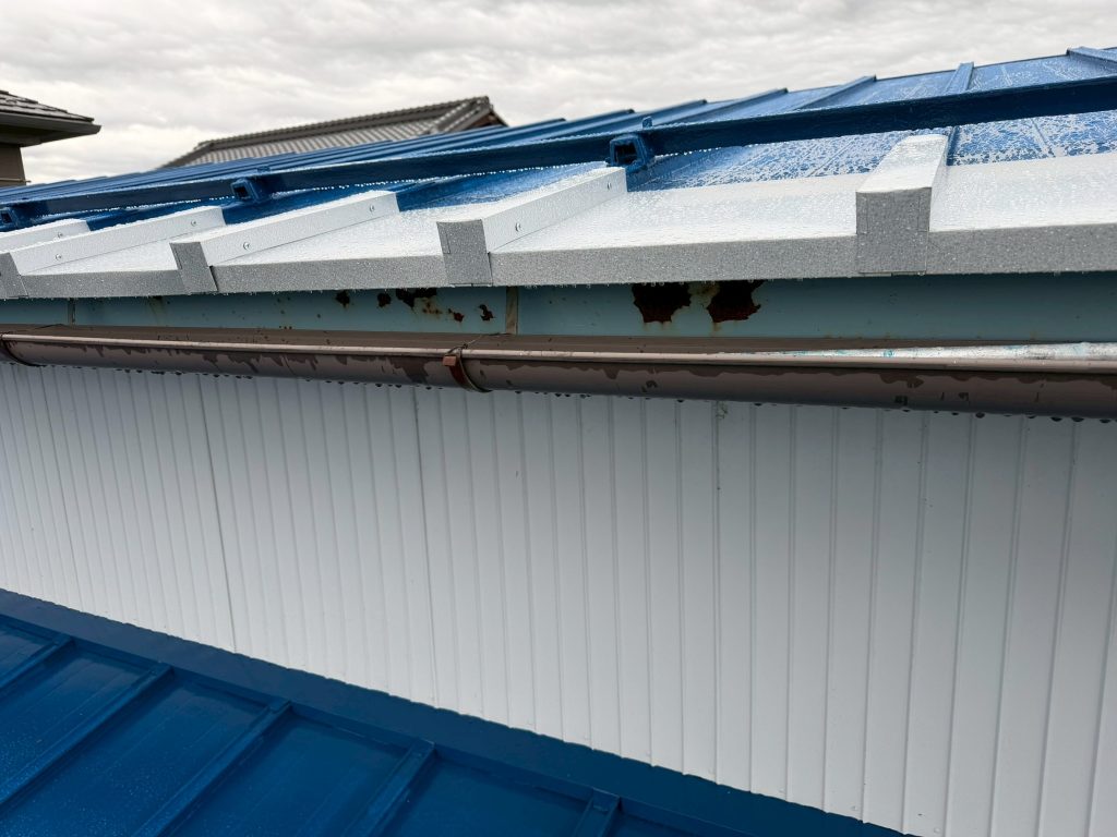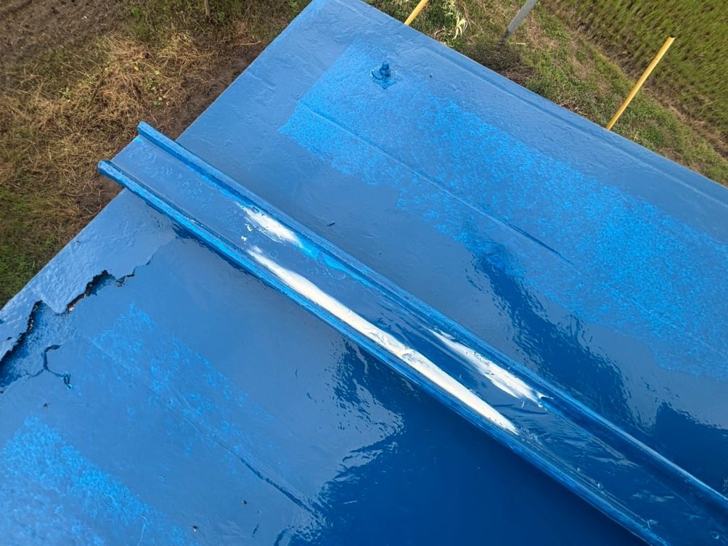 コーキング補修になります。板金で補修する前にひどく劣化して穴が空いている所はコーキングで補修しておきました。隠れる部分ですが結露などの事を考慮してしっかりと塗装してからの補修となります。また、ガルバリウム鋼板で補修した所は繋目部分をしっかりとコーキングしておきました!