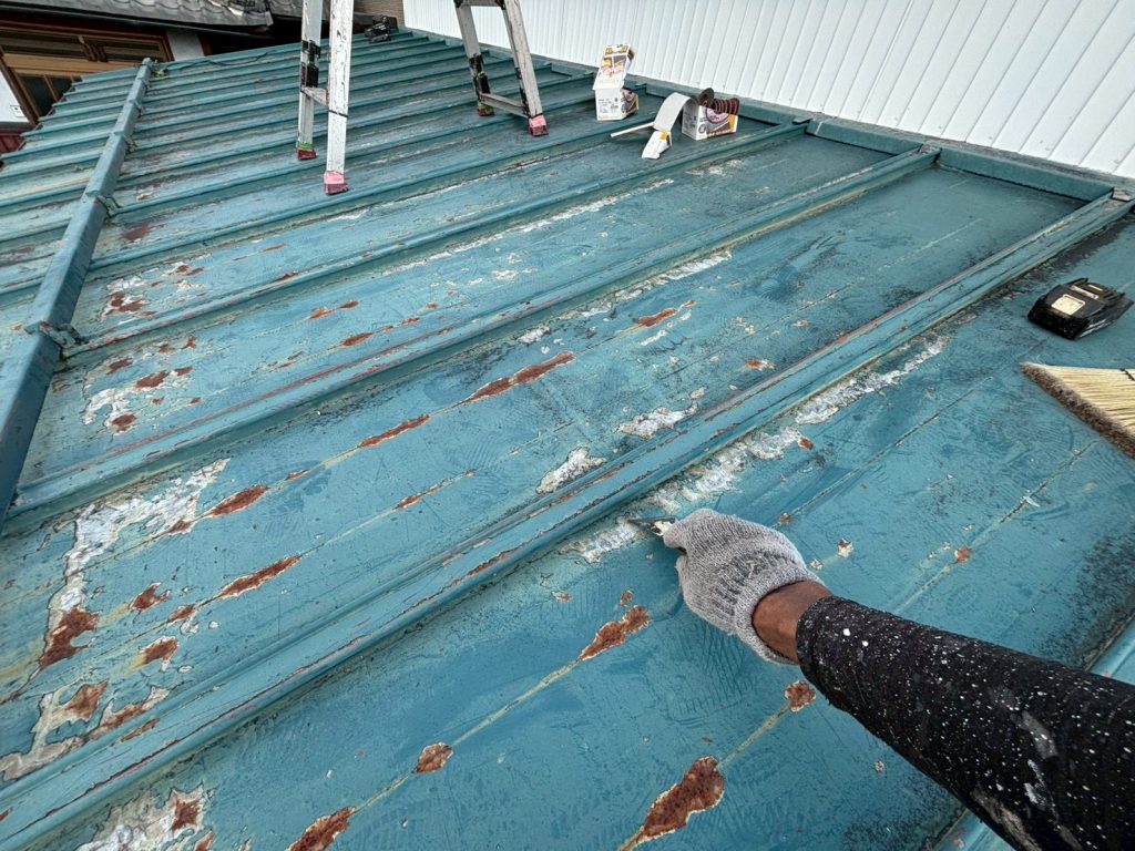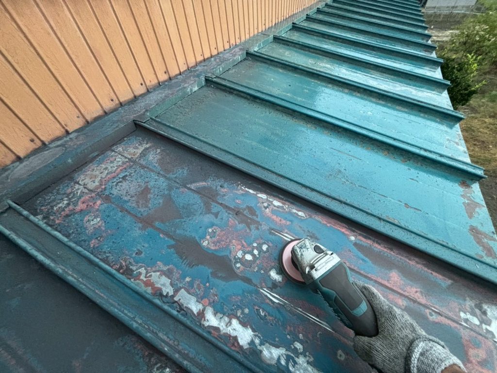 次はケレン作業になります。皮スキや電動工具を使用して以前の塗装時の塗膜も出来る限り凹凸を抑える形でケレン処理しました。