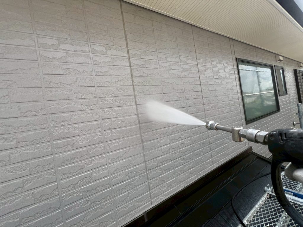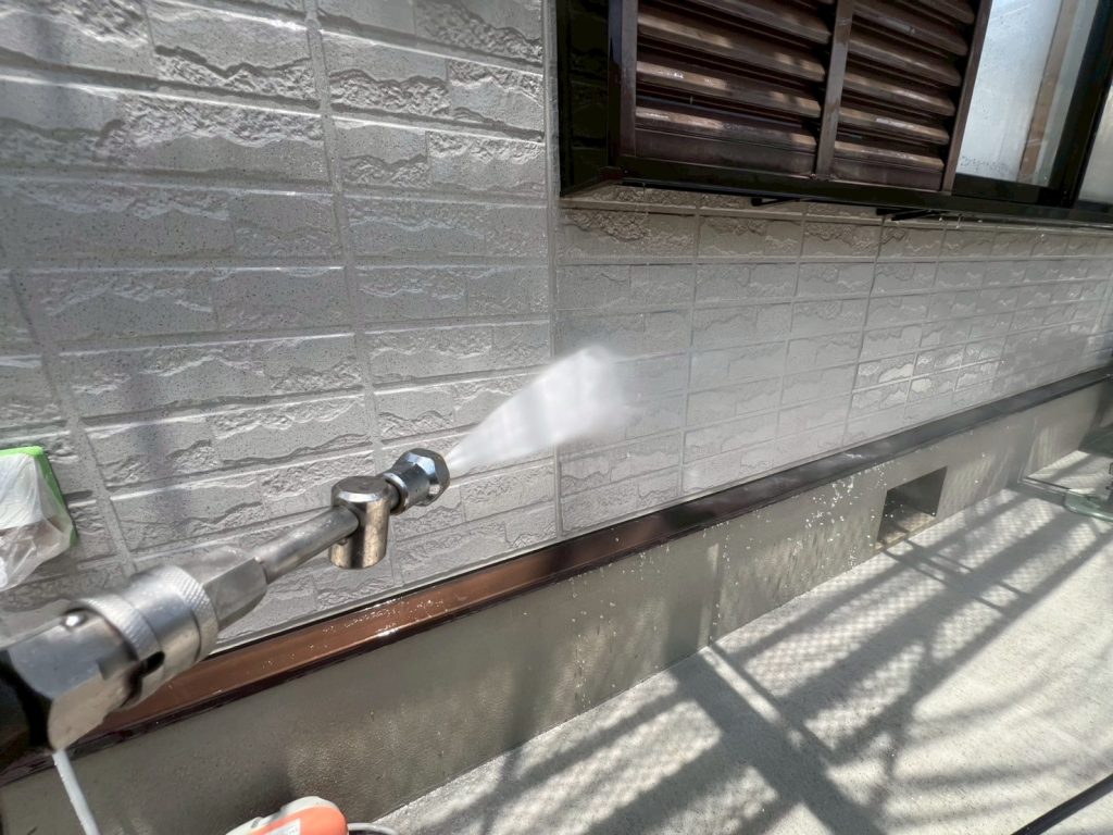 外壁には長年の汚れやコケ・カビなどが付着しているため、専用の薬剤を噴霧してしっかりと浮かせてから高圧洗浄で洗い流していきます。