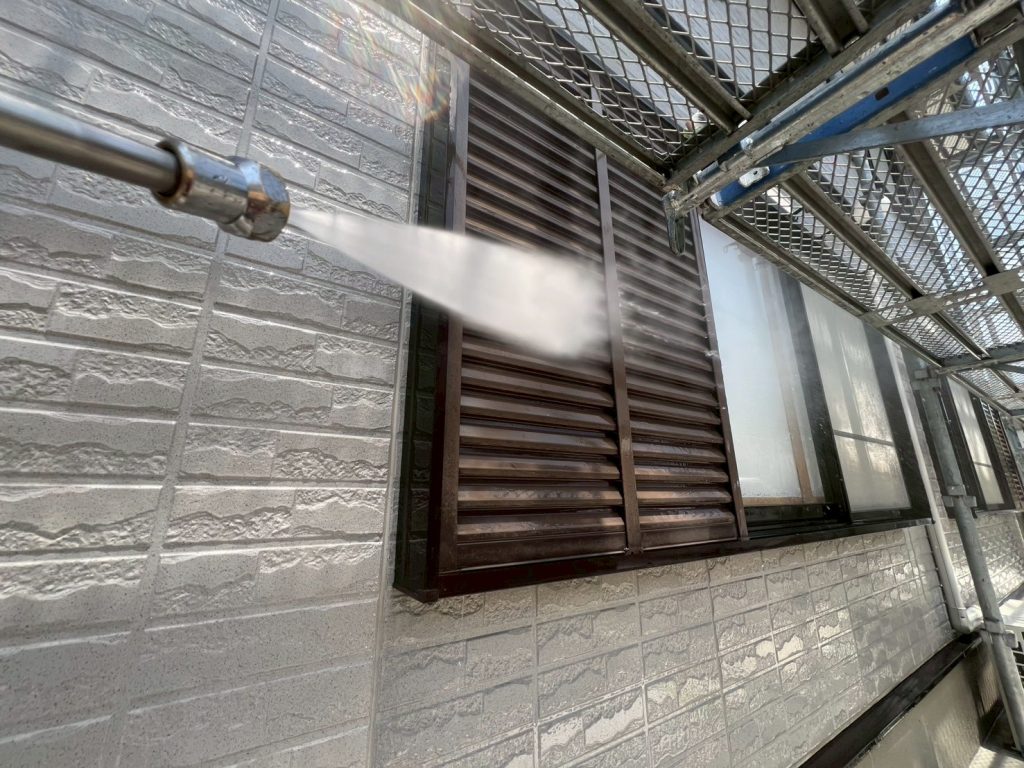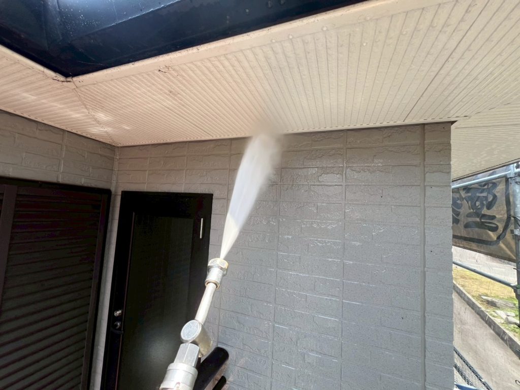 次に、塗装前の大切な下地処理として薬剤噴霧と高圧洗浄を行います。