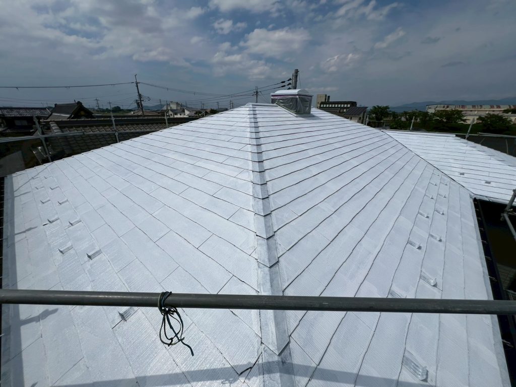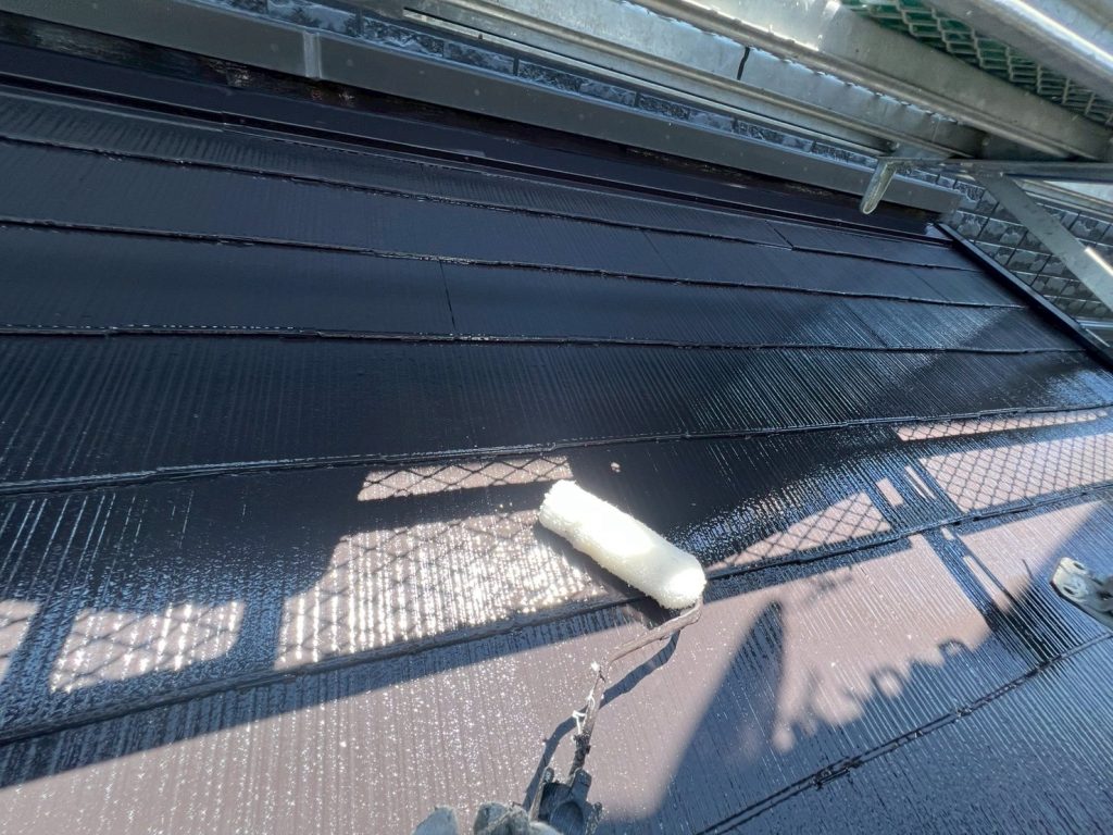 中塗りと同じ塗料をもう一度しっかりと塗り重ねることで、塗膜に十分な厚みを持たせ、紫外線や雨風から屋根を長く守る仕上がりになります。