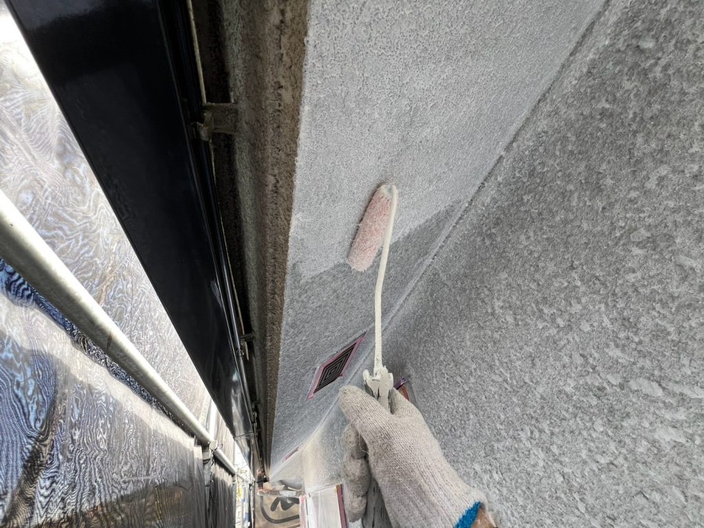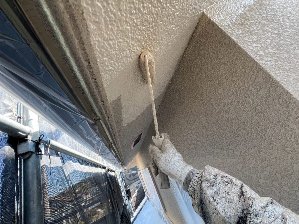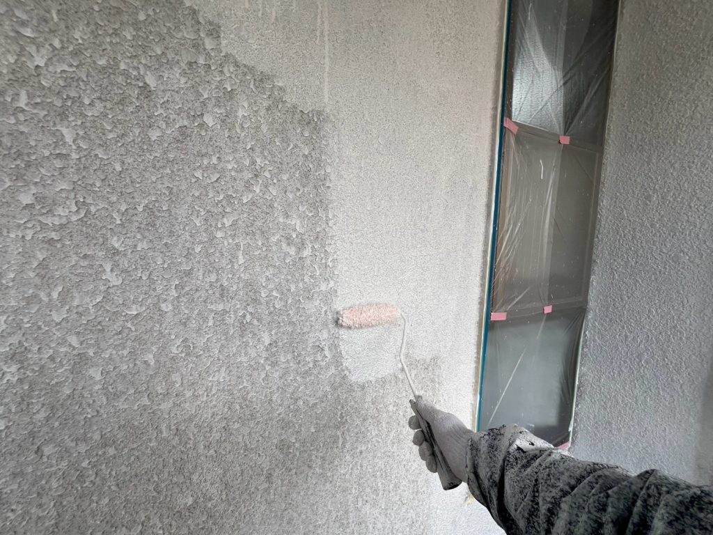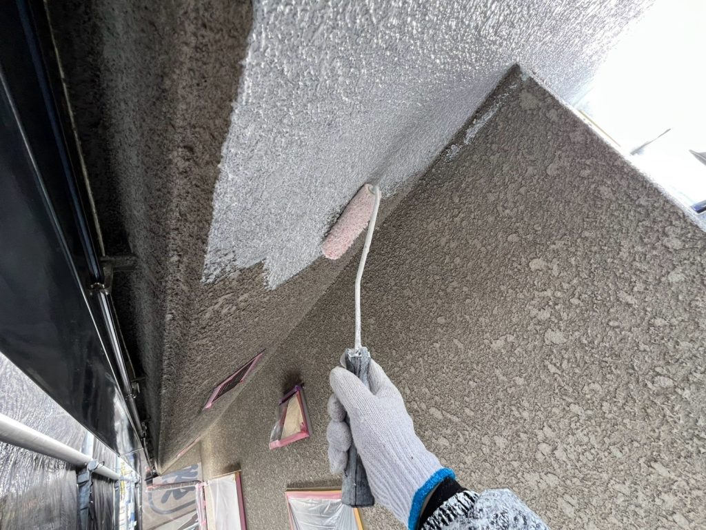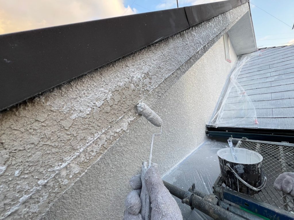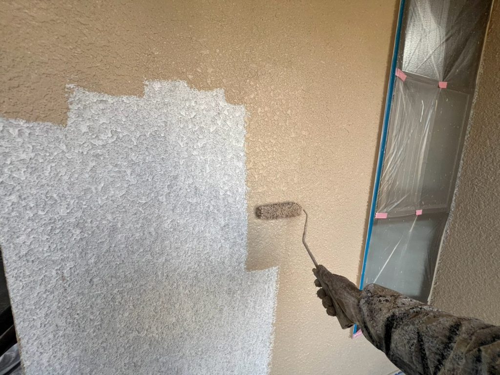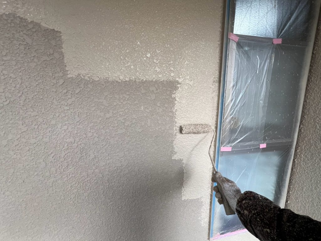 下塗りは、既存の外壁とこれから塗る塗料をしっかりと密着させるためのとても重要な工程です。特に今回の外壁は吸い込みが激しいタイプのため、下塗りを丁寧に行うことで塗料の密着性を高め、仕上がりのムラや耐久性の低下を防ぐ役割があります。