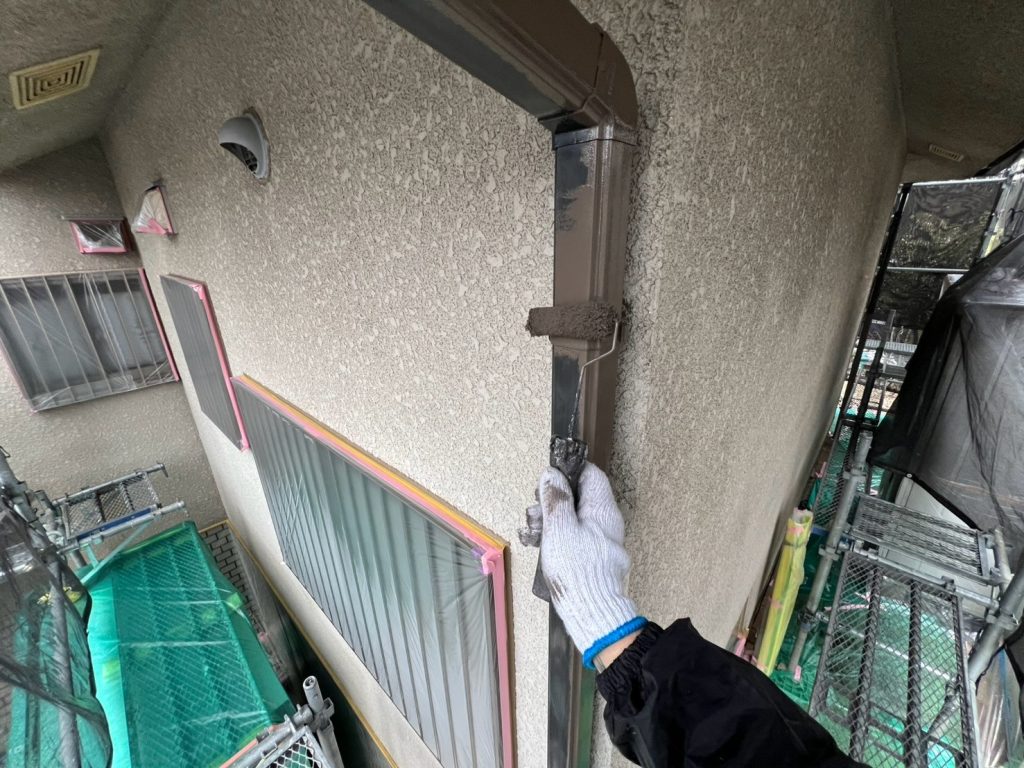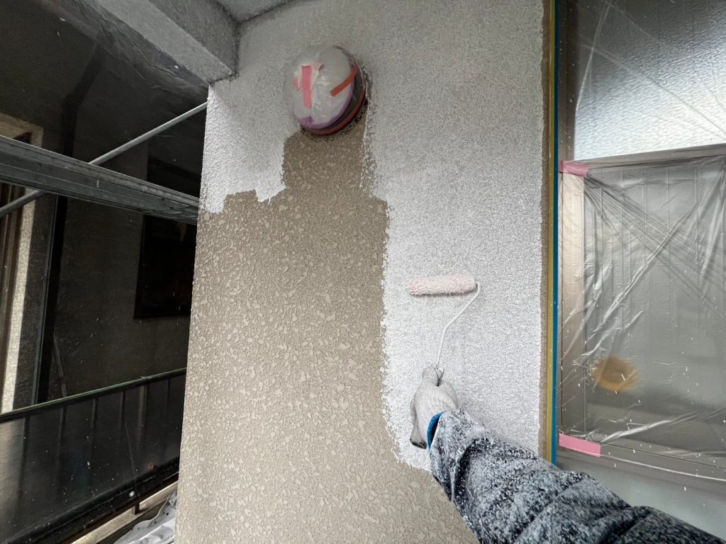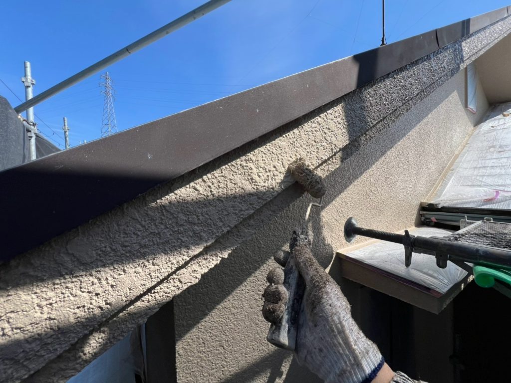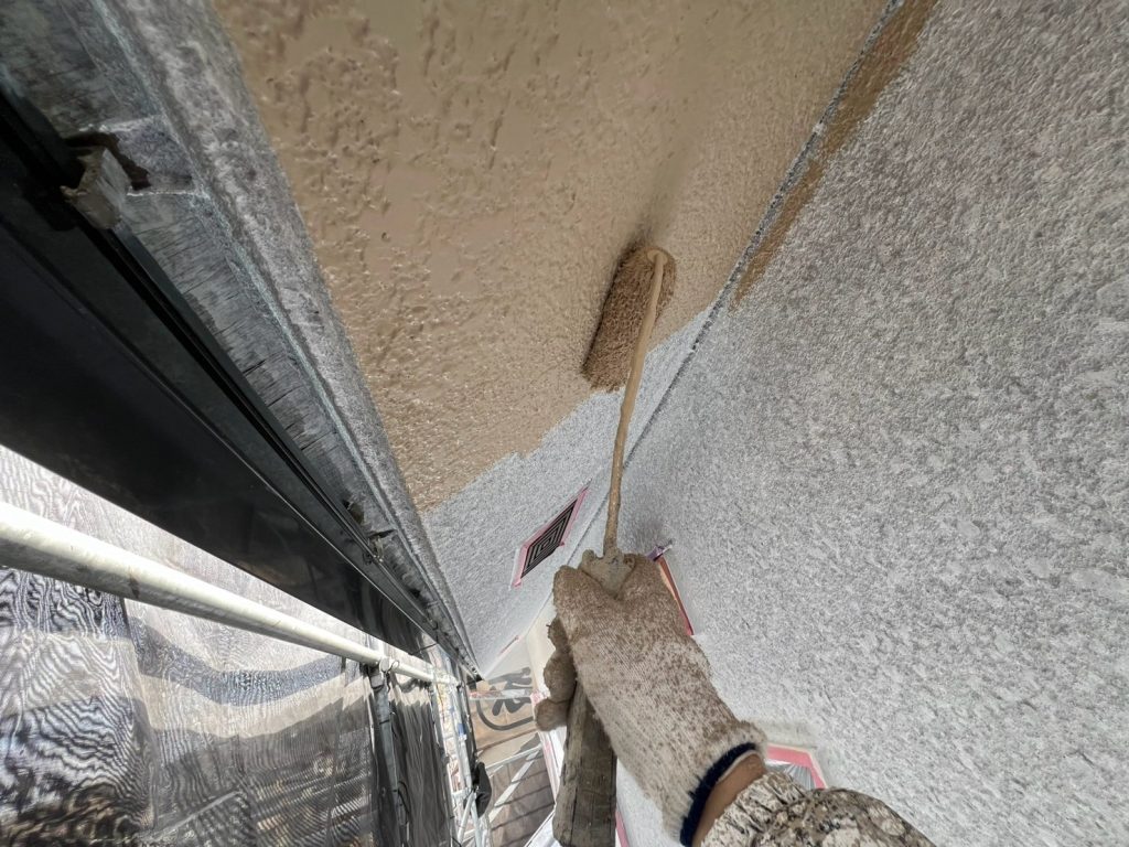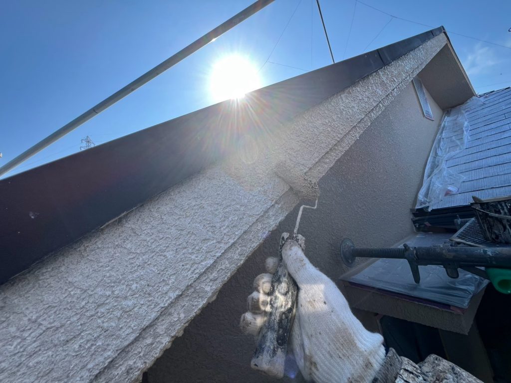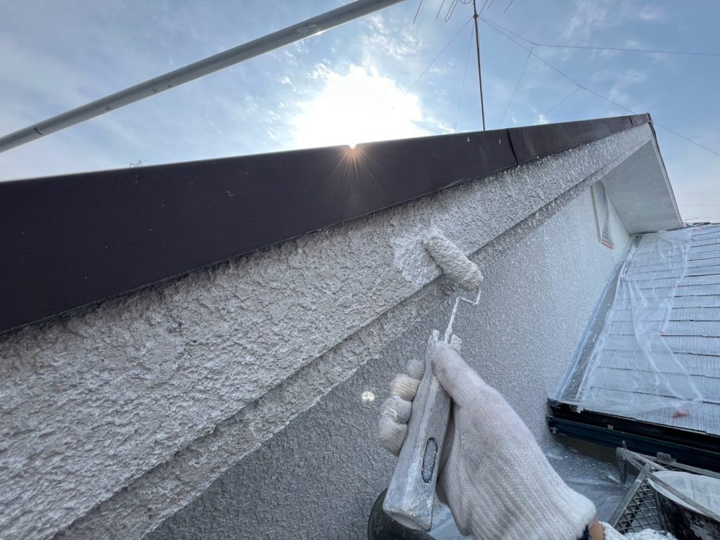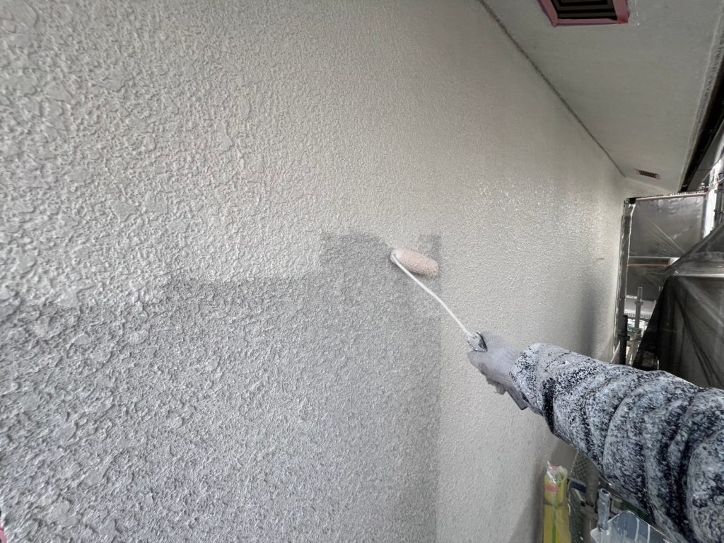 下塗りは、既存の外壁とこれから塗る塗料をしっかりと密着させるためのとても重要な工程です。特に今回の外壁は吸い込みが激しいタイプのため、下塗りを丁寧に行うことで塗料の密着性を高め、仕上がりのムラや耐久性の低下を防ぐ役割があります。