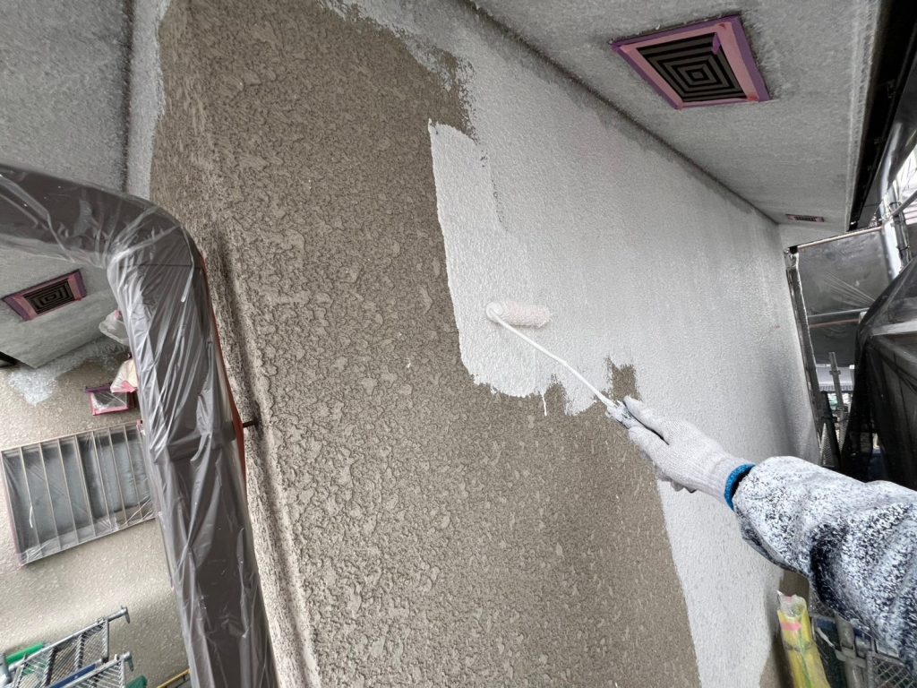 今回の外壁はスタッコ仕上げで塗料の吸い込みが激しい外壁のため、1回目の下塗りだけでは下地が十分に整わない場合があります。そのため、下塗りをもう一度行うことで外壁の吸い込みをしっかりと止め、塗料が均一に密着する下地を作っていきます。