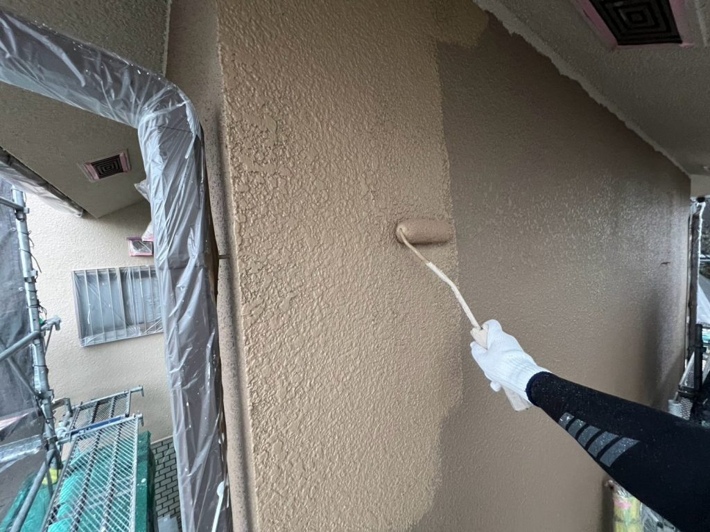 中塗りでは、実際に仕上げで使用する塗料を塗装していき、外壁にしっかりと塗膜の厚みを付けていきます。これにより塗料本来の性能を発揮させ、耐候性や防水性を高めていきます。